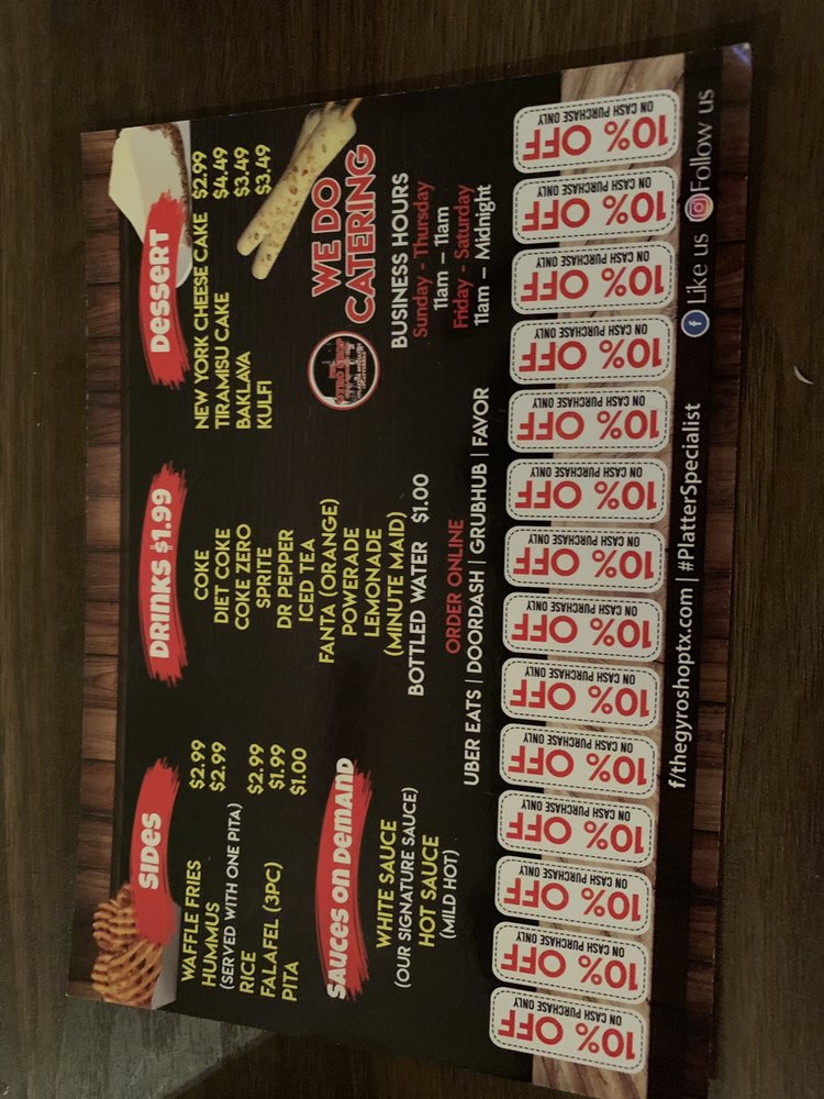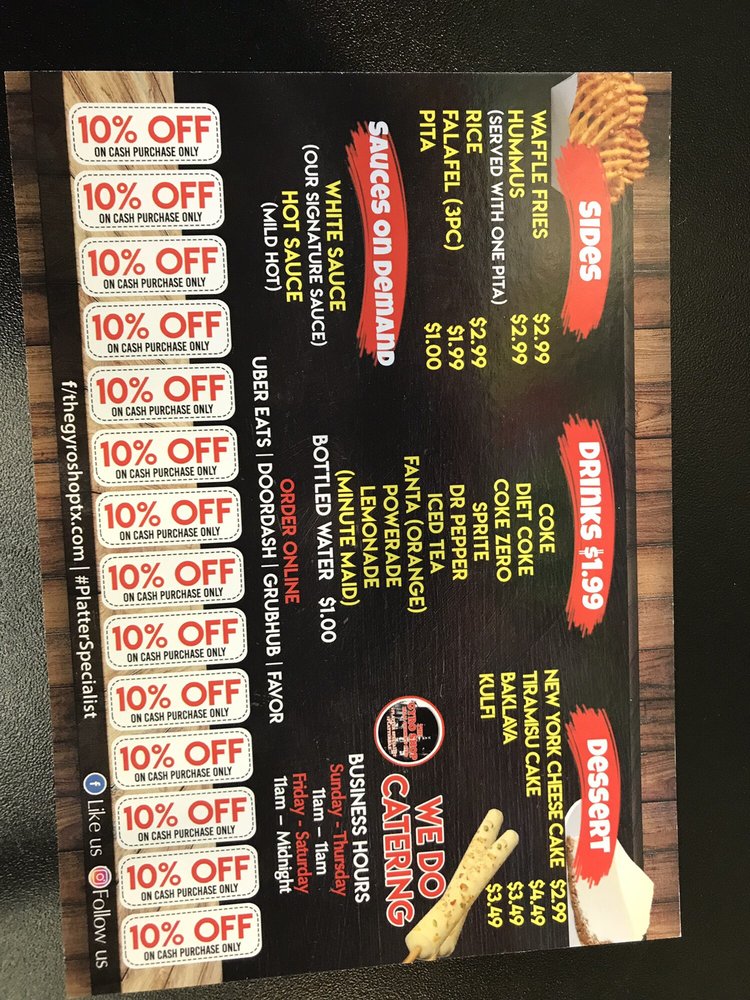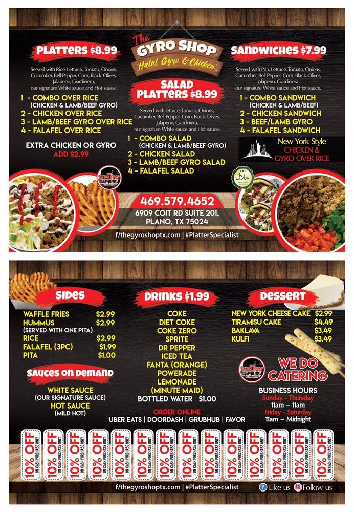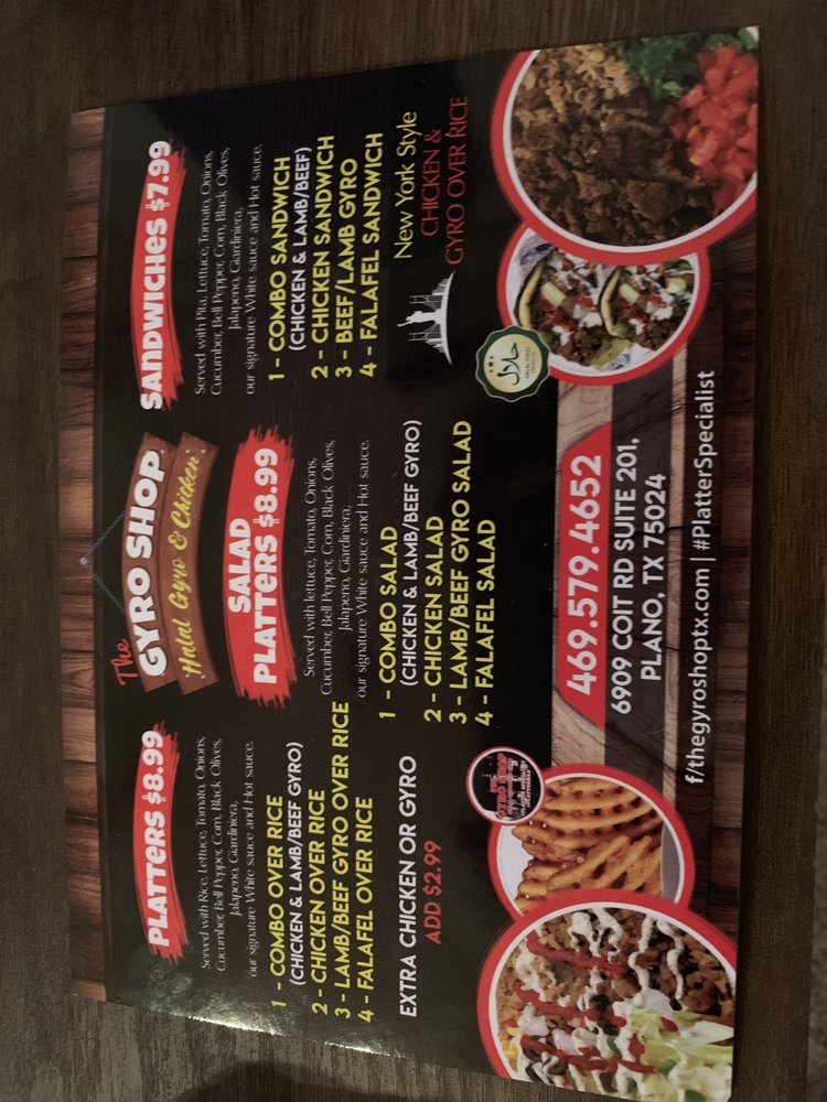 Welcome to The Gyro Shop, a Mediterranean-Halal gem located in Plano, TX. This restaurant offers a variety of options including delivery, takeout, and vegan-friendly dishes. With a menu filled with delicious gyro and chicken bowls, customers rave about the flavorful and well-seasoned meats paired perfectly with their signature sauces. The freshly squeezed juices add a refreshing touch to your meal, with options like the NYC Premium or Jalapeno Boost. Be sure to save room for dessert, as their New York Cheesecake and Baklava are must-tries. Whether you're looking for a quick lunch or a relaxed dinner spot, The Gyro Shop has got you covered. The welcoming atmosphere and friendly staff make dining here a delightful experience. Don't miss out on this hidden culinary gem!