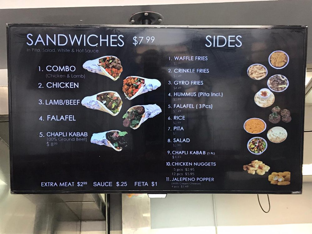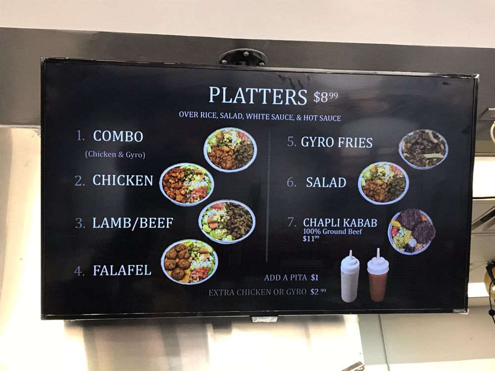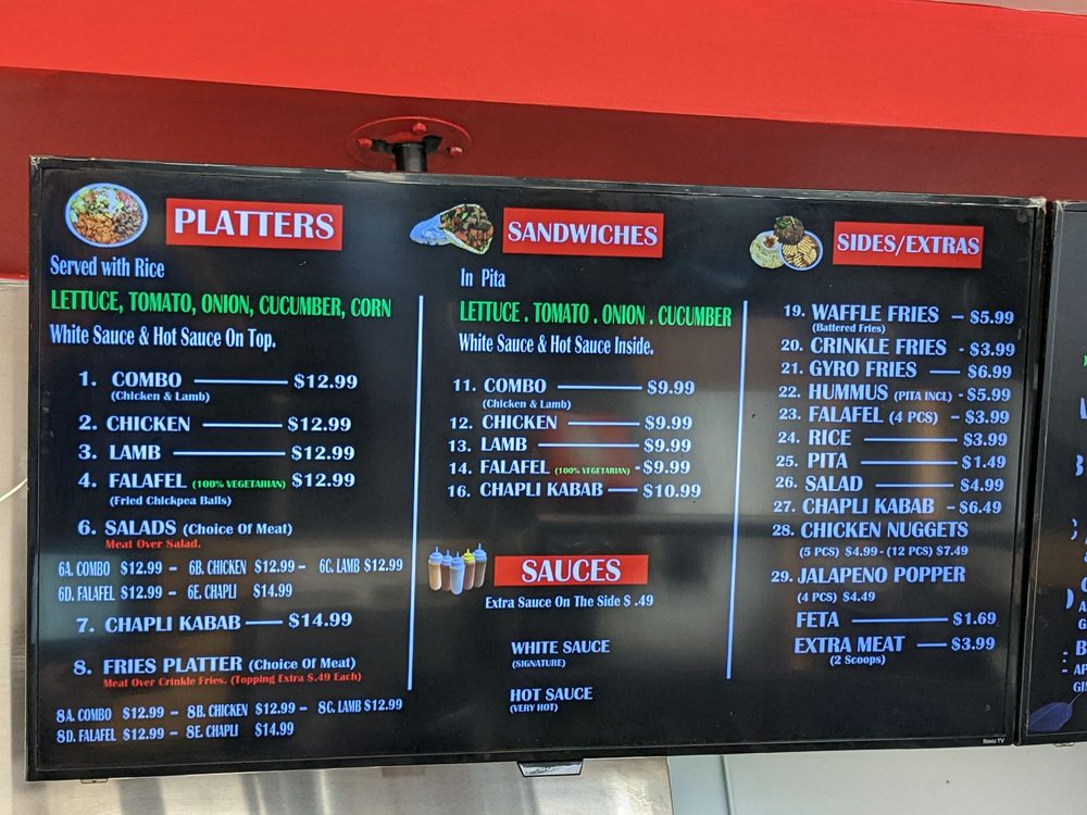 Chicken and lamb over crinkle cut fries with (2 pcs) white sauce and (1 pc) hot sauce.